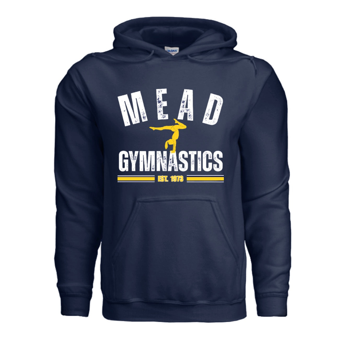 Your classic navy hoodie with a yellow mead gymnastics vinyl decal.