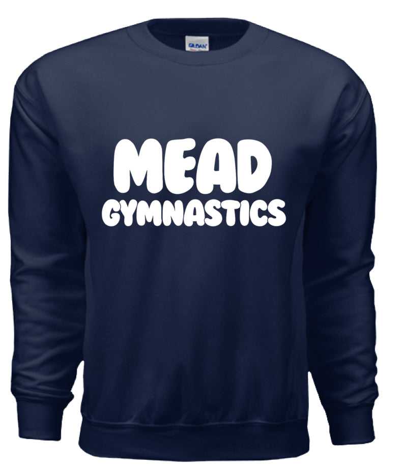 Navy blue Mead Gymnastics crew neck embellished with a white puff vinyl decal. Garments with puff vinyl is best washed inside out on a cold and delicate cycle and laid flat to dry. If you’re not able to lay flat to dry, you can dry inside out on low heat.